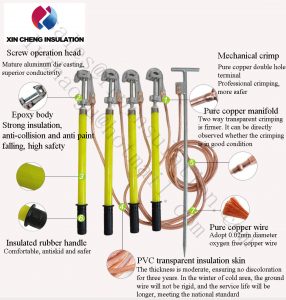Earthing rod: epoxy, with good insulation performance; the length is optional. The hook adopts light aluminum alloy compression casting, pole use the light epoxy manufacture, high strength, excellent ability of electric conduction. Baling wire uses electrolysis copper wire. The temperature scope for protective cover: ±40°C